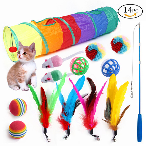 Cat Toys Sets Kitten Toys Assortments, 2 Way Tunnel, Cat Feather Teaser - Wand Interactive Feather Toy Fluffy Mouse
